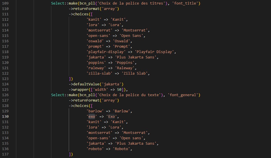 Modifier le fichier params.php en ajoutant une nouvelle ligne pour la nouvelle font ligne 109 ou 126 selon si elle doit être dans les textes, les titres ou les deux
