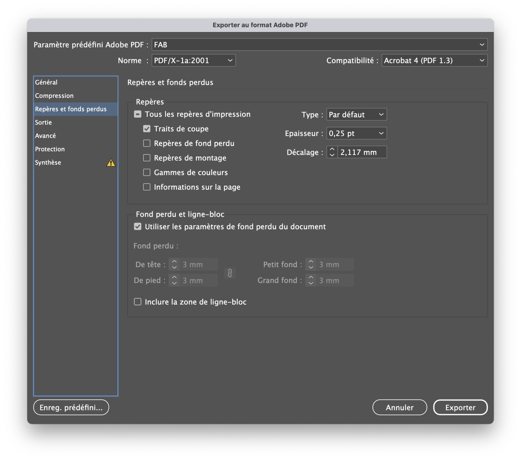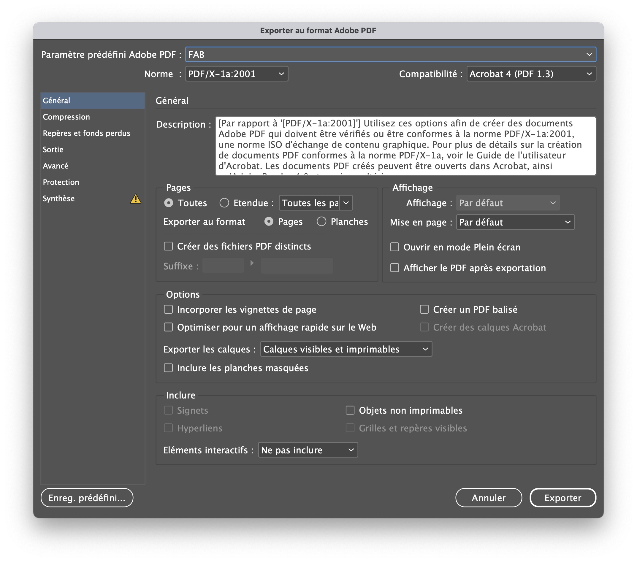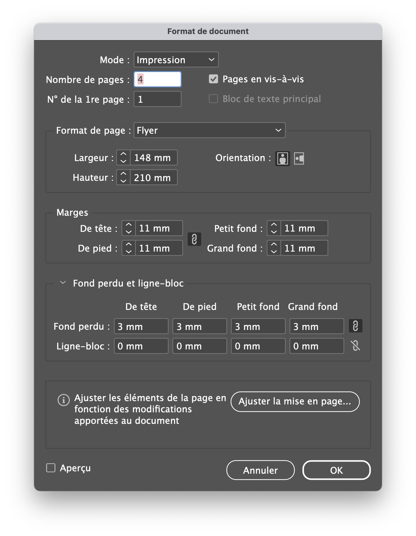 - Choisir Format page ou planche en fonction du document à imprimer (demander à l’imprimeur.)
