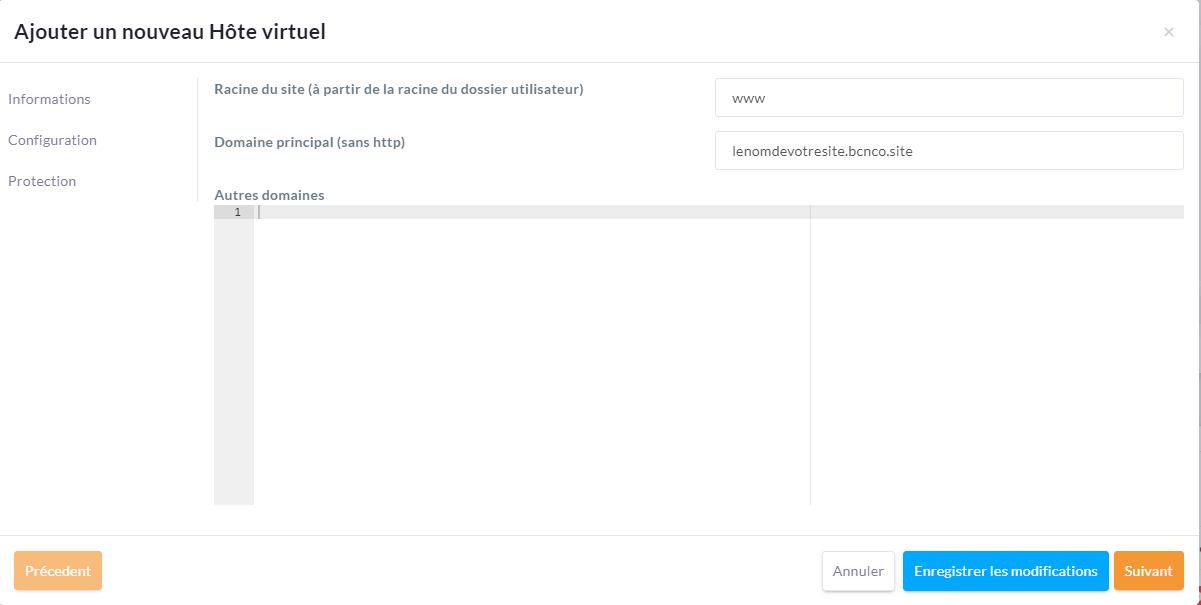 Au niveau du domaine principal, rentrer le nom de votre site suivi de .bcnco.site, exemple : monsite.bcnco.site. Puis cliquer sur Enregistrer les modifications.