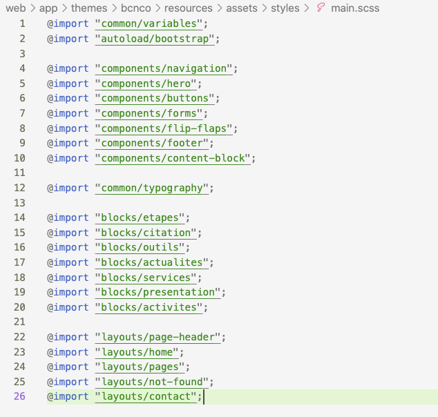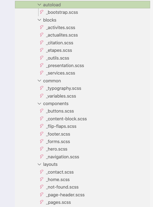 Pour l’intégration CSS, c’est pré-processeur Sass qui est utilisé avec une structure de dossier comme ci-dessous pour organiser les styles: