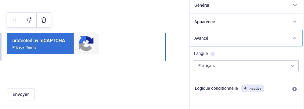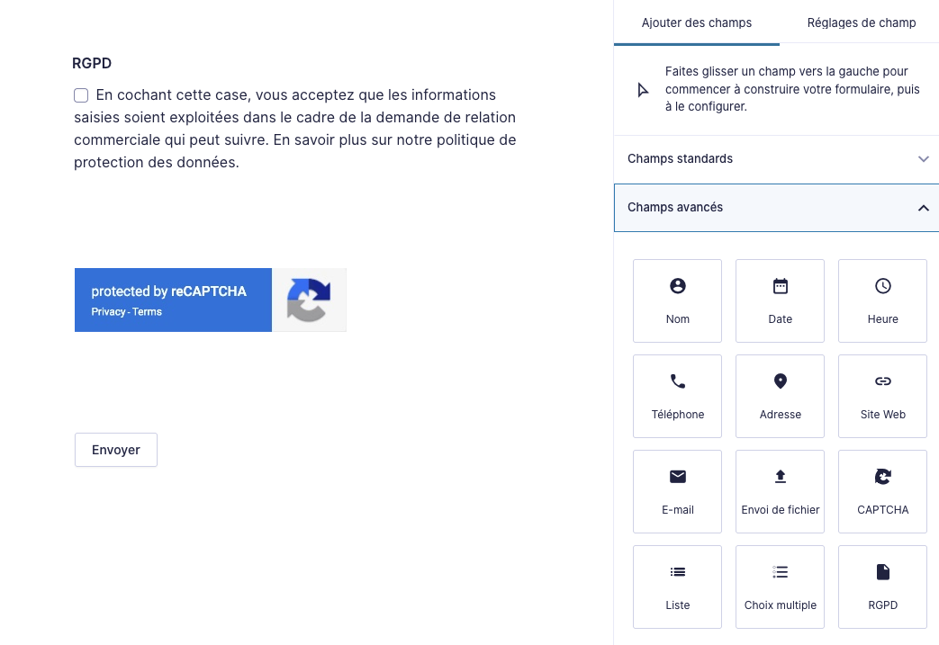 Dans champs avancés il faut faire un glisser / déposer du champ Captcha là où vous voulez le positionner dans votre formulaire (généralement au dessus du bouton de validation)