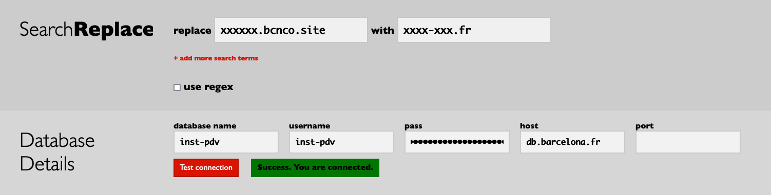 et renseigner les infos de la base de données voir ci-dessous (le mot de passe est visible depuis inst-pdv chez abtel)