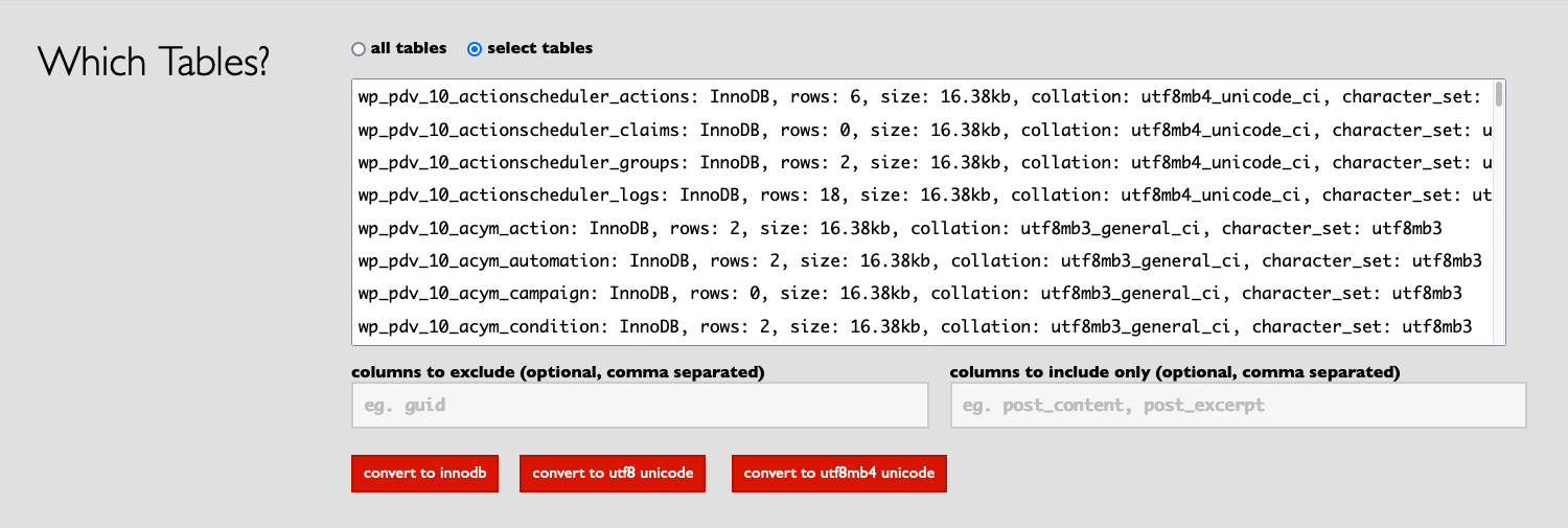 Idéalement il faut choisir seulement les tables qui commencent par wp_xx ou xx vaut l’id du site et toutes les tables qui commencent par wp_ mais qui n’ont pas de nombres (elles sont tout en bas du tableau)